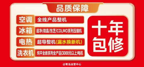 为感恩长期支持,美的特推出长期品质保障,空调全线产品整机,电热超导整机(漏水换新机),冰箱超净/微晶/东芝/COLMO系列压缩机,洗衣机纯平全嵌系列全产品(3000元以上)电机,皆享十年包修!